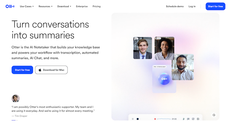 Otter.ai 是一款功能強大的 AI 語音轉文字與會議筆記助手工具,專注於自動 語音轉錄(speech-to-text)、即時錄製與摘要生成,並支援與 Zoom、Google Meet、Microsoft Teams 等視訊會議整合,幫助你自動捕捉會議內容、整理重點與生成可搜尋的文字記錄。它適合個人、學生、創作者與團隊使用,以提升效率與溝通品質。